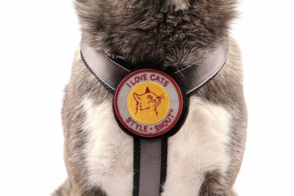 反射性の上部には高品質の刺繍が施されており、背面は StyleSnout®社のアウトドア&セーフティ ハーネスの胸部プレートにフィットするように作られたベルクロ生地で作られています。